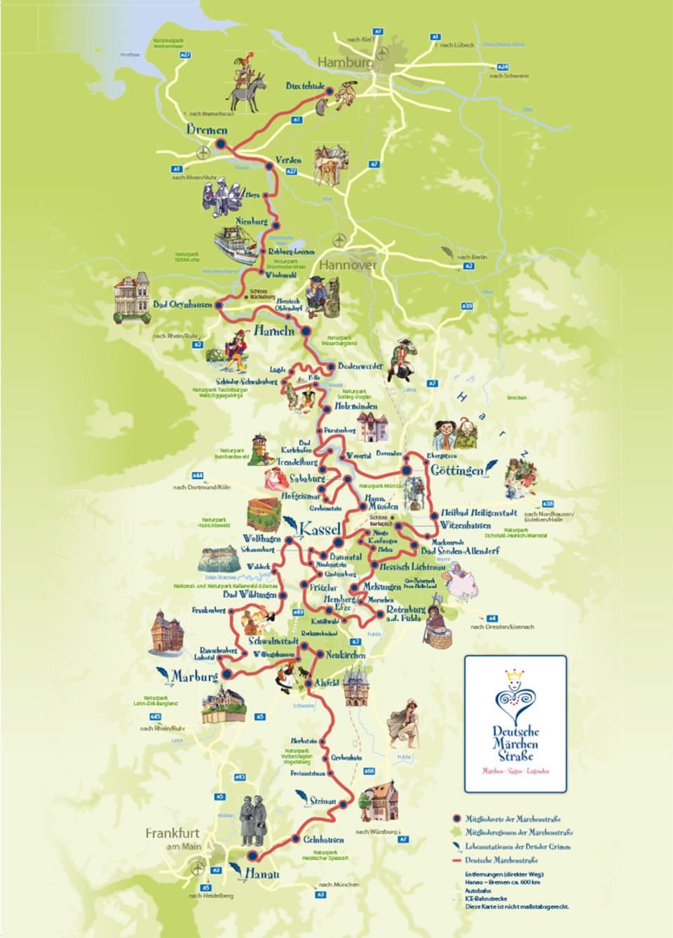 Istituito nel 1975, questo itinerario turistico lungo circa 600 chilometri collega oltre 60 località legate alle fiabe dei fratelli Grimm, partendo da Hanau (città natale dei fratelli) fino a Brema, attraversando paesaggi incantevoli della Germania centrale.